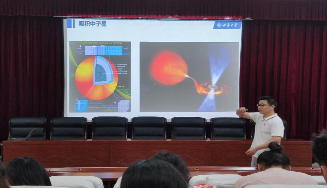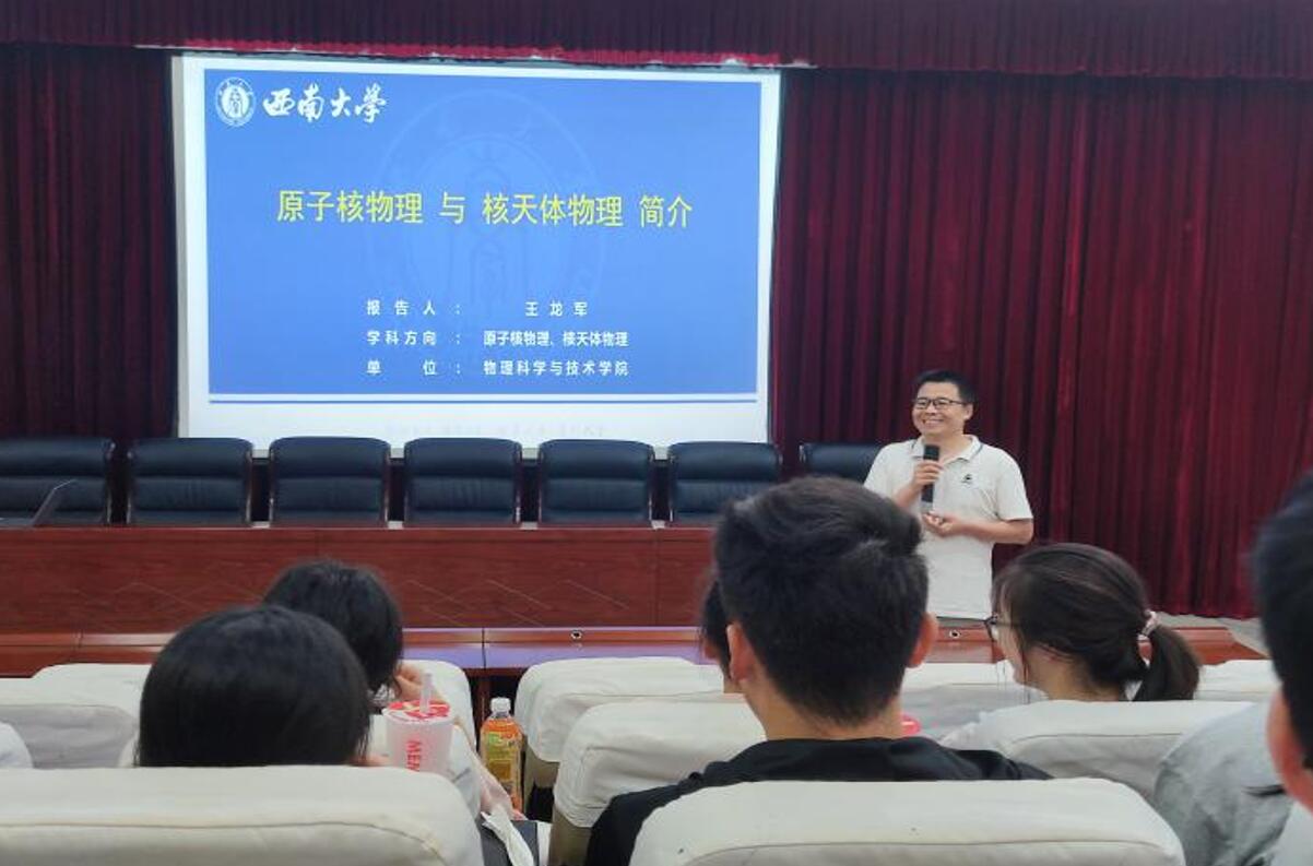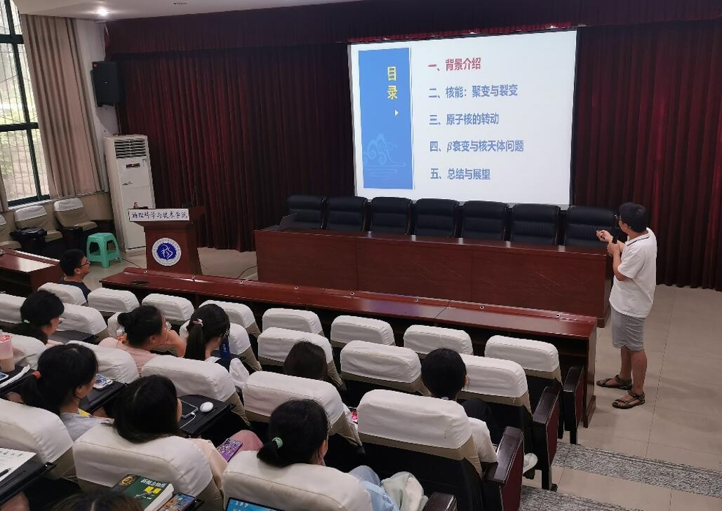 6月8日,第十二期悟理论坛在物理大楼小阶梯教室举行,2021级物理学2班承办此次论坛。本期论坛的主题是“原子核物理与核天体物理简介”,王龙军副教授应邀担任主讲嘉宾,副院长桑文龙、a片无码 团委书记贺颖老师参会。