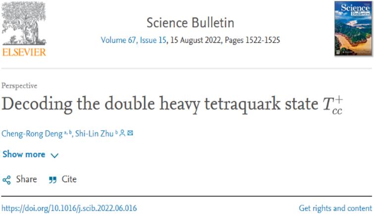 近日,a片无码 强子物理团队邓成荣教授在新强子态领域取得重要研究进展,相关成果《Decoding the double heavy tetraquark state Tcc》[1]发表在中国卓越计划领军期刊Science Bulletin。Science Bulletin是由中国科a片无码 和国家自然科学基金委员会共同创办的自然科学综合类刊物,(2022年发布的影响因子为20.557),位于中科院JCR分区升级版综合类期刊一区(61本期刊排名第7)。 该成果第一完成单位为a片无码-成人a片-免费无码a片 ,邓成荣教授为第一作者,北京大学朱世琳教授为通讯作者。