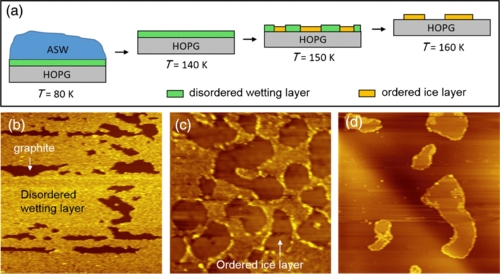利用低温生长方法在石墨衬底上制备出一种高密度的单层冰。与传统的六角冰不同,这种冰是由水六聚体自组装而成,类似于水的高压相冰II。实验发现这种单层冰具有良好的韧性,类似于二维原子晶体石墨烯。理论计算表明,石墨衬底能够对水分子施加有效的“压强”,从而形成高压相冰II。该结果为实验研究固体表面的高压效应提供了一种新手段。