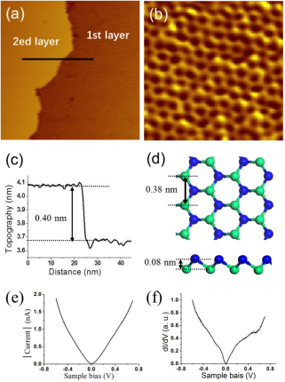 利用两步法在Si(111)基底上制备两个原子层厚的镓烯。第一层是具有重构的过渡缓冲层,第二层是类似于石墨烯的六角蜂窝结构。为了与Si衬底的晶格相匹配,镓烯在竖直方向上存在较大的皱褶。这是国际首次报道的外延生长的镓烯。