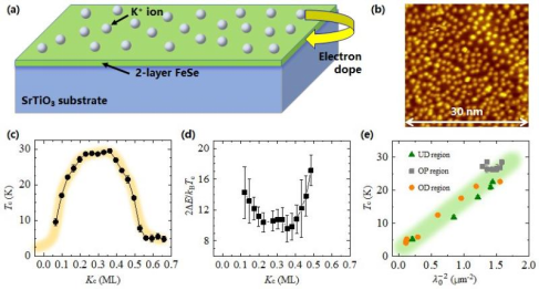 结合分子束外延技术及多种原位测量手段,对钾原子吸附的多层FeSe薄膜超导特性展开系统研究,获得了各种超导参数(超导能隙、转变温度和超流密度等)在调控作用下的变化。实验结果清楚地揭示出相刚度而非配对势是决定FeSe超导层超导转变温度的主要因素。