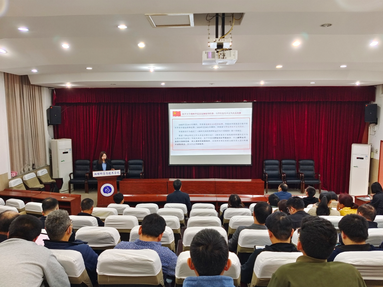 随后,刘汭雪副书记重点带领大家学习教育部关于高校教师违反职业行为十项准则警示案例(第10-11批),与大家一道再次学习了《新时代高校教师职业行为十项准则》,强调新时代对广大教师从教行为提出了新的更高要求。刘书记指出,大家要进一步增强责任感、使命感、荣誉感,规范职业行为,明确师德底线,努力成为有理想信念、有道德情操、有扎实学识、有仁爱之心的好老师。同时通过详细讲解教育部关于高校教师违反职业行为十项准则警示案例(第10-11批),要求教师以案为戒,积极筑牢思想防线,严守师德底线,树立良好师风。