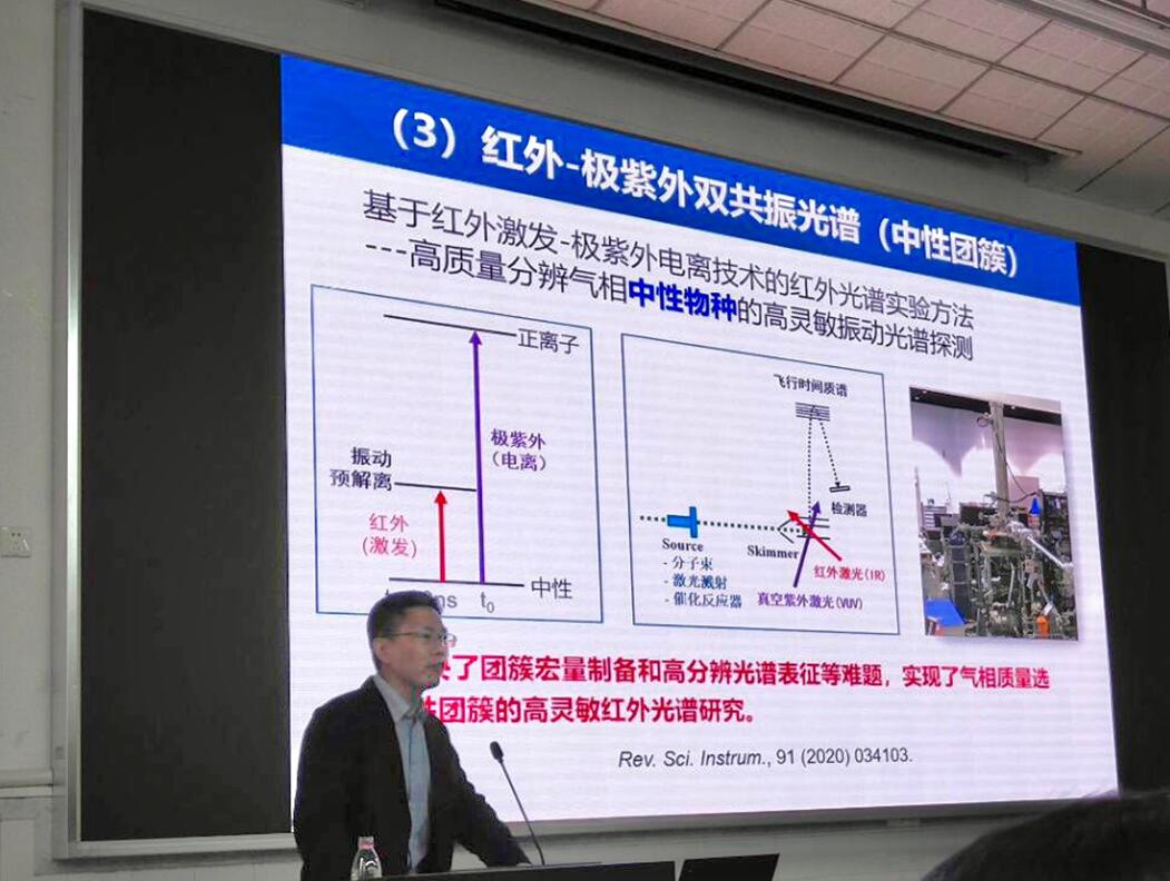 的教师、研究生、大三本科生近200人到场聆听,并积极参与会后讨论。江凌研究员首先论述了团簇研究对深刻认识和理解物质转化规律的重大意义;然后介绍了中科院大连物化所自主研制的中性团簇红外光谱和离子团簇红外光谱实验装置,并实现了质量选择团簇的高灵敏探测、结构表征和反应性能研究;最后,江凌研究员报告其所在团队发现最小水滴立体结构是由五个水分子团簇(H2O)5组成的研究发现过程,打破了前人对最小水滴是由六个水分子团簇组成的认知。
