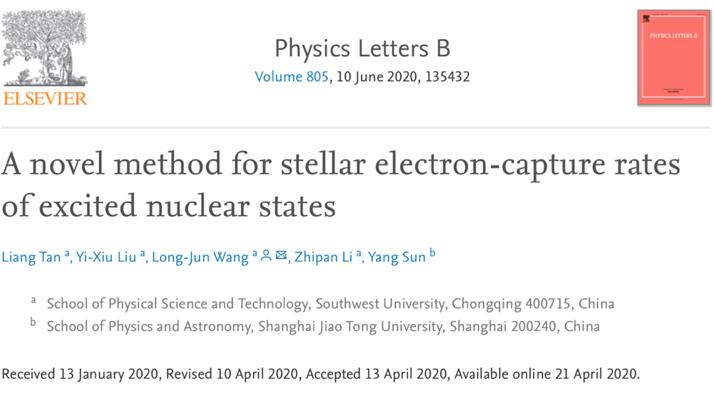 近日,a片无码 “核物理与天体物理”研究团队在天体物理中的弱相互作用过程方面取得了重要进展,相关工作发表于核物理与核天体物理权威期刊《Physics Letters B》上。该研究工作的题目为:“A novel method for stellar electron-capture rates of excited nuclear states”。这篇工作的发表标志着该课题组正式向天体物理中与弱相互作用有关的若干个领域的进军与拓展。