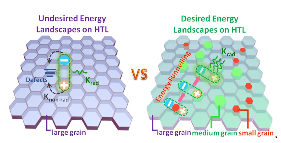 金属卤化物钙钛矿发光材料与器件,是当下国际研究的前沿课题。在诸多钙钛矿结构中,准二维钙钛矿比传统三维钙钛矿更具性能优势,是电致发光领域的“明星材料”。在准二维钙钛矿发光器件中,空穴传输层是至关重要的功能层。先前的研究已经证实,空穴传输层对空穴注入效率、钙钛矿薄膜的表面形貌,甚至薄膜的缺陷态密度都有重大的影响。本工作中,陈平副教授团队采取稳态与超快瞬态光谱相结合的研究手段,对沉积在不同空穴传输层上的PEA2Csn−1PbnBr3n+1准二维钙钛矿展开研究,首次论证了空穴传输层对准二维钙钛矿“多量子阱结构”和“能量转移过程”的影响,并由此制备了高效率的准二维钙钛矿发光器件。