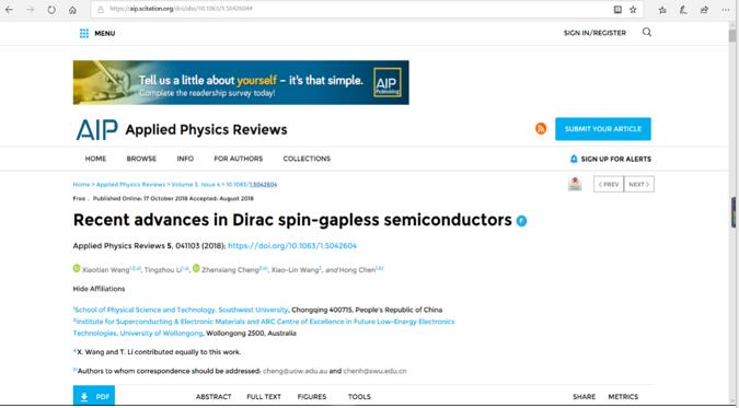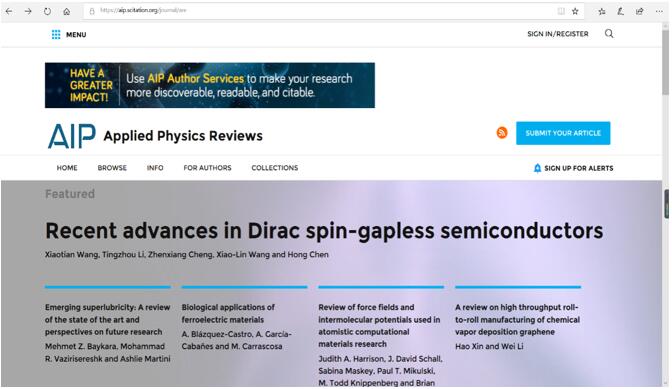 近日,a片无码 陈洪教授科研团队在AIP旗下Applied Physics Reviews期刊发表了题为“Recent advances in Dirac spin-gapless semiconductors”的综述论文,系统阐述了Dirac型自旋无能隙半导体的物理机制、研究现状和发展方向。Applied Physics Reviews为AIP旗下顶级物理类综述期刊,最新影响因子为12.89。a片无码 为该论文第一完成单位,王啸天副教授及本科生李汀洲为共同第一作者,通讯作者为陈洪教授和澳大利亚伍伦贡大学Z.X. Cheng教授,另外自旋无能隙半导体材料的提出者X.L. Wang教授也被邀请为合作者为我们的论文质量把关。该论文被审稿人和主编高度评价,评选为特色论文(蓝色Featured [F] 标识),并在APR网站a片无码上置顶。