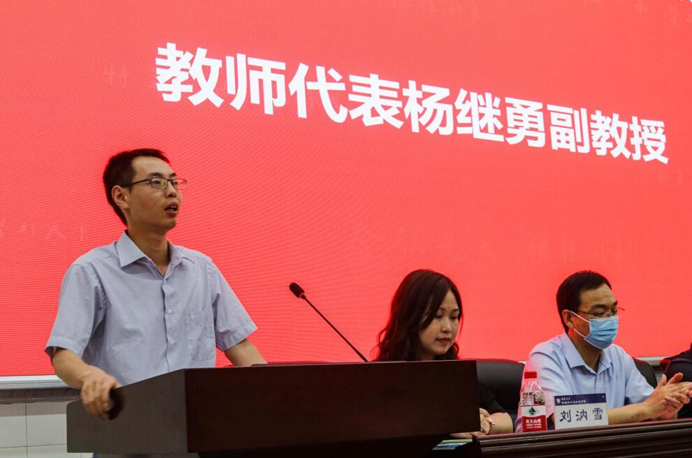 教师代表杨继勇副教授结合自己的学习生活科研经历,为新生们总结了“坚定梦想、自律自强、勤于思考、勇于创新、立足本职、感恩亲人、友爱同学”七点宝贵建议,并祝愿新生们能像朝阳一样迸发活力,乘风破浪,勇往直前。