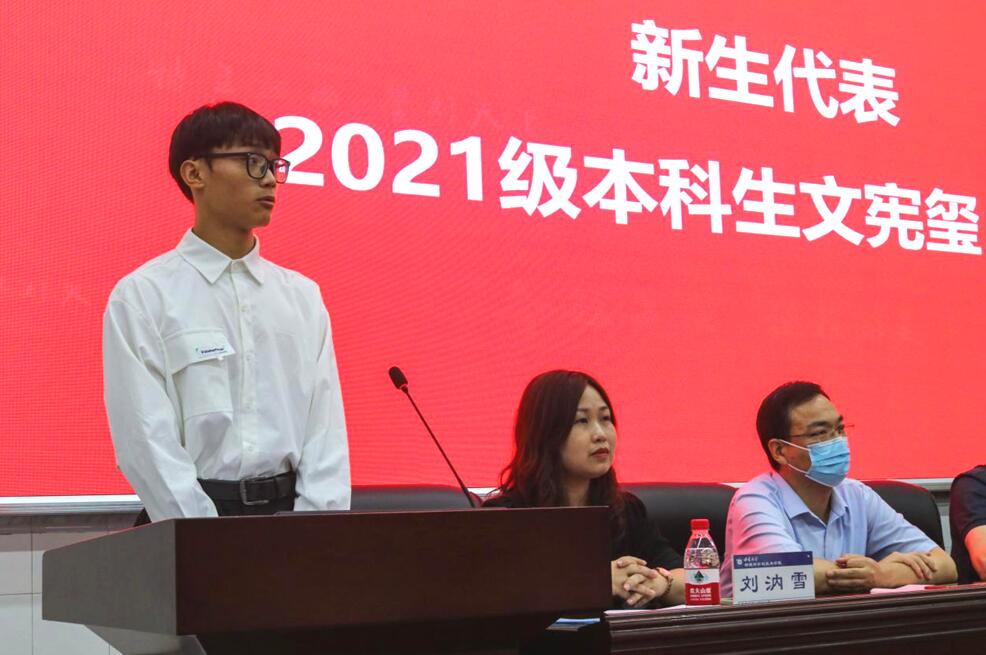 2021级本科生物理学师范专业文宪玺同学作为新生代表发言,他讲述了自己选择物理、投身教育的初心,表示会秉承a片无码 院训精神,努力提升学科素养,不负时代,不负使命、不负青春。