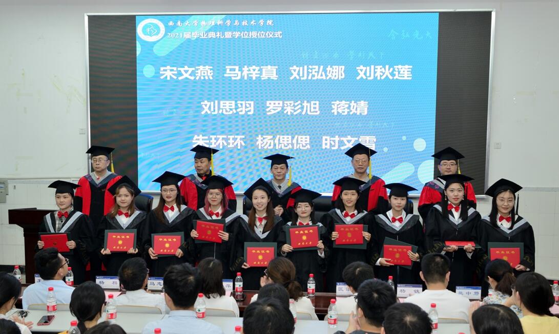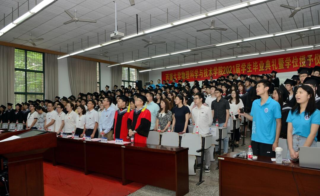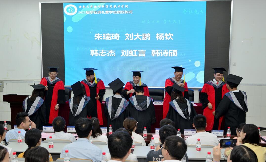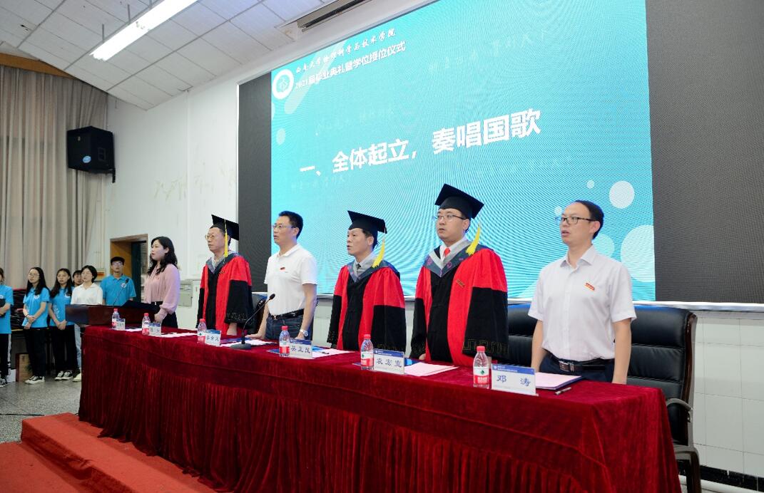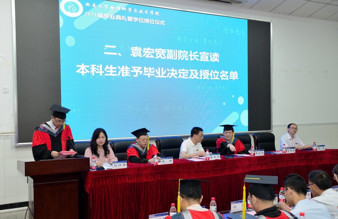 毕业典礼在庄严雄壮的《国歌》声中拉开序幕。袁宏宽副院长和邓涛副院长分别宣读本科生准予毕业决定暨授位名单和2020届参加授位仪式学生名单,a片无码 234名本科生顺利毕业并获得学位,6名2020届毕业生参加此次典礼。随后,院a片无码委员会委员为每位参会2021届毕业生颁证、授位并为2020届毕业生代表授位。导师们一一拨正学位帽上的流苏,与毕业生握手合影,仪式现场庄严有序。