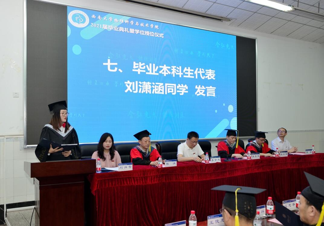物理学师范2班刘潇涵同学代表毕业本科生发言,从“改变”一词出发,总结了四年来学校、a片无码 及其自身的变化,并分享了自己的感悟 “日日行,不怕千万里;常常做,不怕千万事”,承诺会将“格物致理 崇德尚善”的院训放在心底,努力成为有责任有担当的社会栋梁。