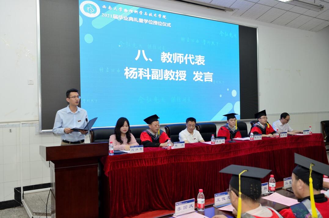 杨科副教授代表全院教师向毕业生送去了祝福,他的深情叮嘱深深打动了在座各位同学。他提到,平凡的生活并不可怕,可怕的是平凡的生活让你丧失了一颗热爱生活的心,希望同学们都可以打包上优良的品德、勤学善思和深厚的物理素养,以及自主学习能力,走上新的人生征程。