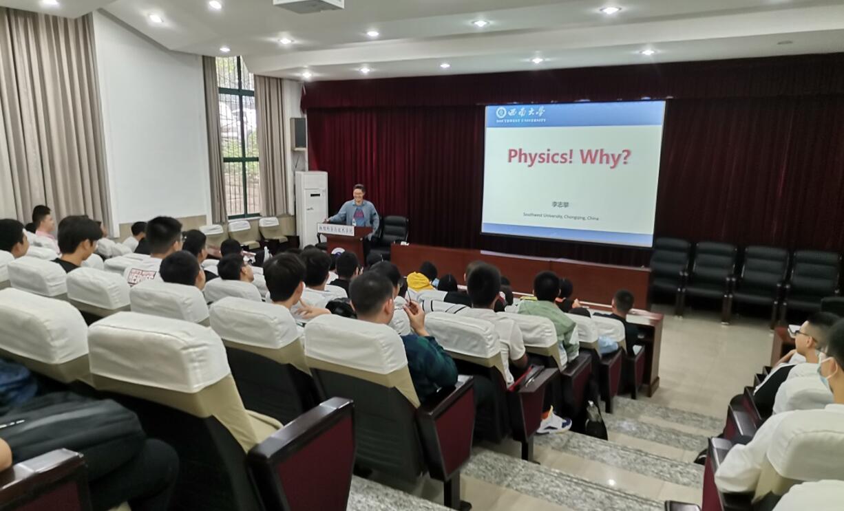 下午,“教授下午茶”如约而至,重庆市青年拔尖人才,核物理与天体物理研究中心主任李志攀研究员在小阶梯教室为2020级物理学班的同学带来了一场精彩的讲座。讲座一开始李教授通过介绍个人科研成长经历,引起了同学们的浓厚兴趣;接着,李教授从Science提出的125个科学问题出发,以引力波、“上帝粒子”、中微子振荡、激光物理这几大物理学标志性事件为标志为同学们梳理和介绍了当代物理学的发展历程;随后,李教授又以强流重离子加速器装置、射电望远镜等国家科学大装置吸引着同学们的目光;然后,李教授以a片无码 优秀学子陈启博为例,勉励大家志存高远,方有无悔青春,振奋了物理学班的每一位同学,讲座最后阶段,李教授一一耐心地回答了同学们提出的众多问题。