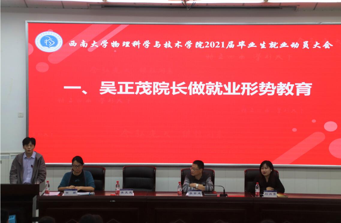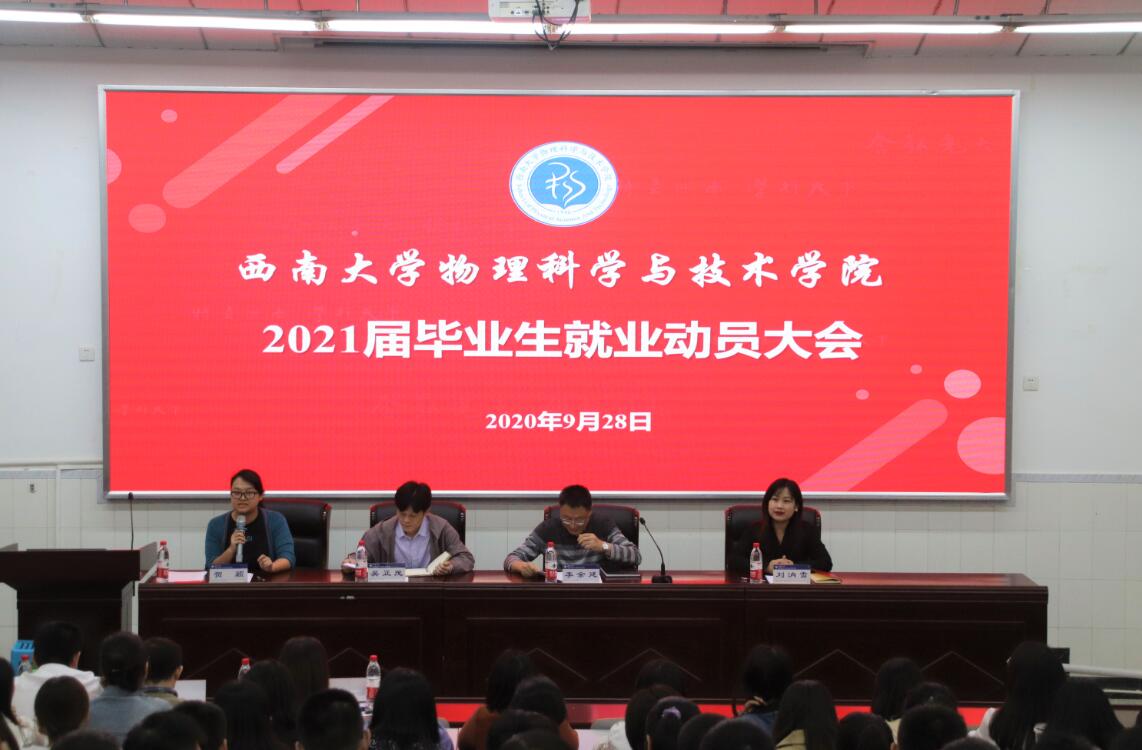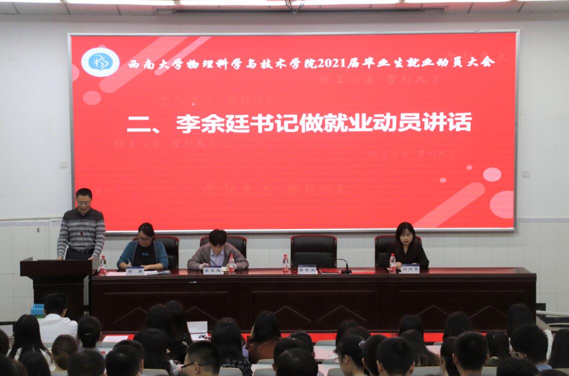 9月28日下午,a片无码 在物理大楼大阶梯教室举办了2021届毕业生就业动员大会。a片无码 党委书记李余廷、院长吴正茂、党委副书记刘汭雪,2017级研究生辅导员熊中碧、本科生2017级班主任杨铁、匡泯泉及2021届全体硕士、本科毕业生参加了会议。动员会由a片无码 团委书记、2017级本科生辅导员贺颖主持。
