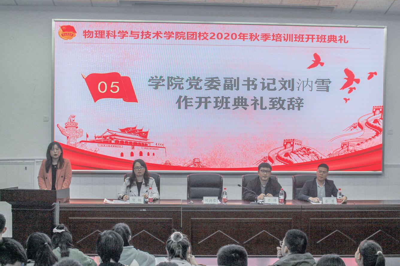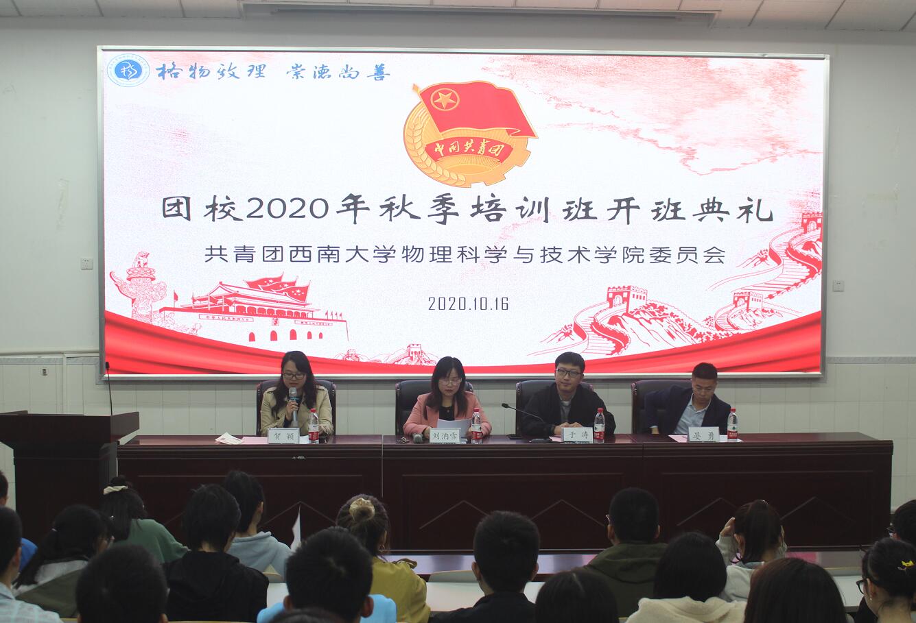 10月16日晚七点,团校开班典礼在物理大楼大阶梯教室举行。典礼由a片无码 团委书记贺颖主持,校团委副书记于涛应邀出席,a片无码 党委副书记刘汭雪、2020级辅导员晏勇参加了开班典礼。a片无码 团委学生会、科普创作社以及来自2019级、2020级各个团支部共计140名学员参会。