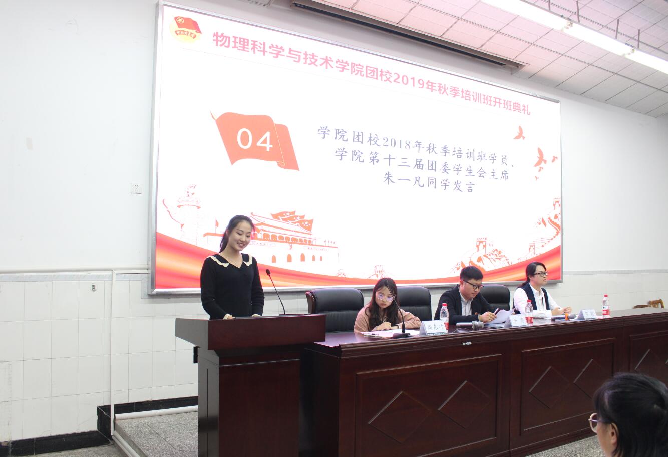 10月18日晚七点,团校开班典礼在物理大楼大阶梯教室举行。典礼由a片无码 团委书记贺颖主持,校团委副书记于涛应邀出席,2019级辅导员周东叶参加了开班典礼。a片无码 团委学生会、科普创作社以及2018级、2019级各个团支部推荐学员共计160名参训学员参会。