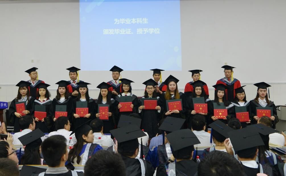 毕业典礼在庄严雄壮的《国歌》声中拉开序幕。吴正茂副院长、袁宏宽副院长分别宣读研究生、本科生准予毕业决定暨授位名单,a片无码 5名博士生、56名研究生、238名本科生顺利毕业并获得学位。随后,院a片无码委员会委员为每位毕业生颁证、授位。导师们一一拨正学位帽上的流苏,与毕业生握手合影,仪式现场庄严有序。