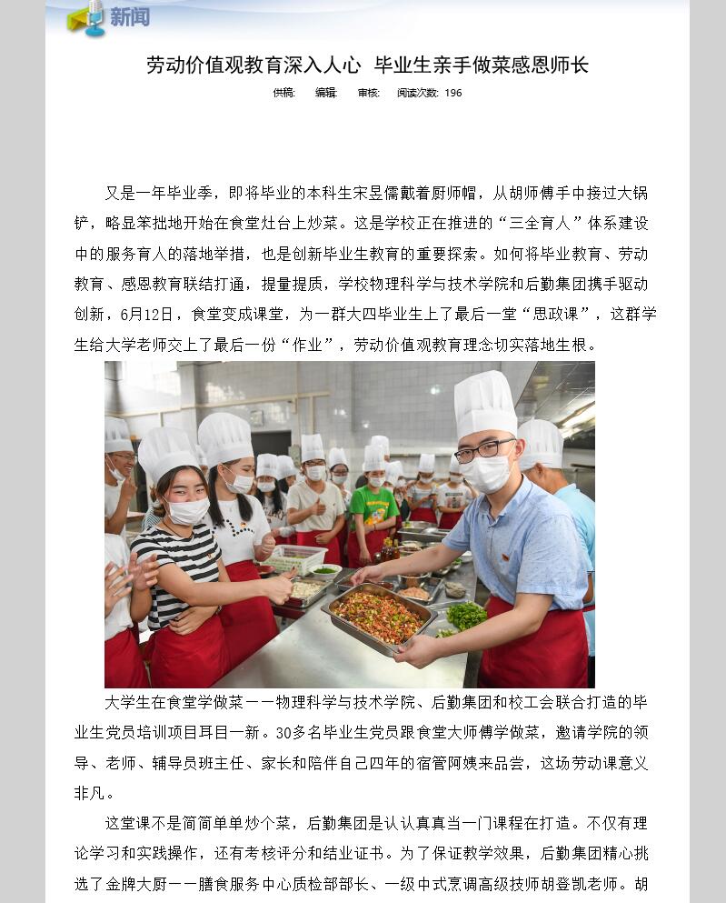 为创新a片无码 毕业生党员教育,推进“三全育人”体系建设中的服务育人举措在a片无码 落地,6月12日,a片无码 党委专门联合学校后勤集团、校工会,让30多名本科毕业生党员跟食堂大师傅学做菜,亲手做出一桌原汁原味的“谢师宴”,邀请a片无码 领导老师、辅导员班主任、家长和陪伴自己四年的宿管阿姨来品尝,作为毕业生的最后一堂劳动课。
