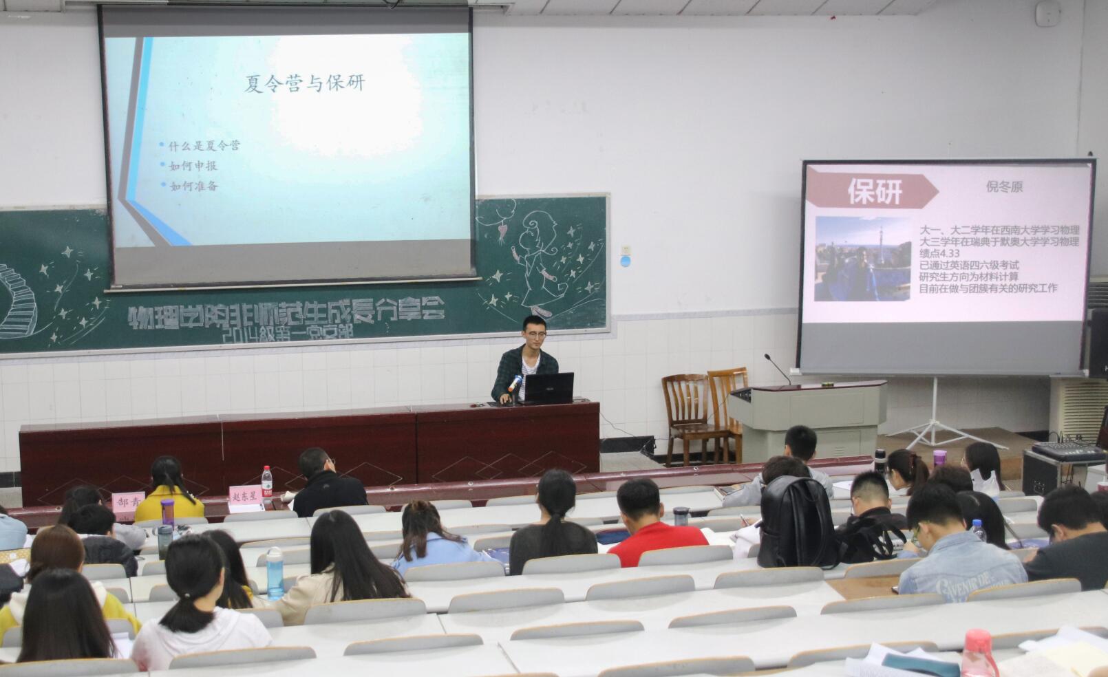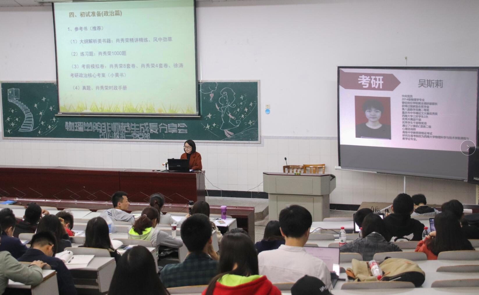 分享会第一环节为考研经验交流。考取本院凝聚态物理专业的王影同学、考取本院课程与教学论专业的吴斯莉同学和考入成都电子科技大学无线电物理专业的李国宇同学分享了各自的考研经历。在英语复习方面,王影建议分为“单词记忆”“真题演练”“背诵范文”三个阶段进行准备,强调要熟悉物理名词的英文单词;李国宇强调“在阅读中加强单词的积累”;吴斯莉指出“英语学习贵在坚持,得分在阅读理解”。他们就专业课教材版本、政治复习提纲、高数历年真题进行了介绍和推荐,建议学弟学妹们要“主动联系在读研究生、查找意向学校的考试真题、关注意向a片无码 官网发布的政策信息”。