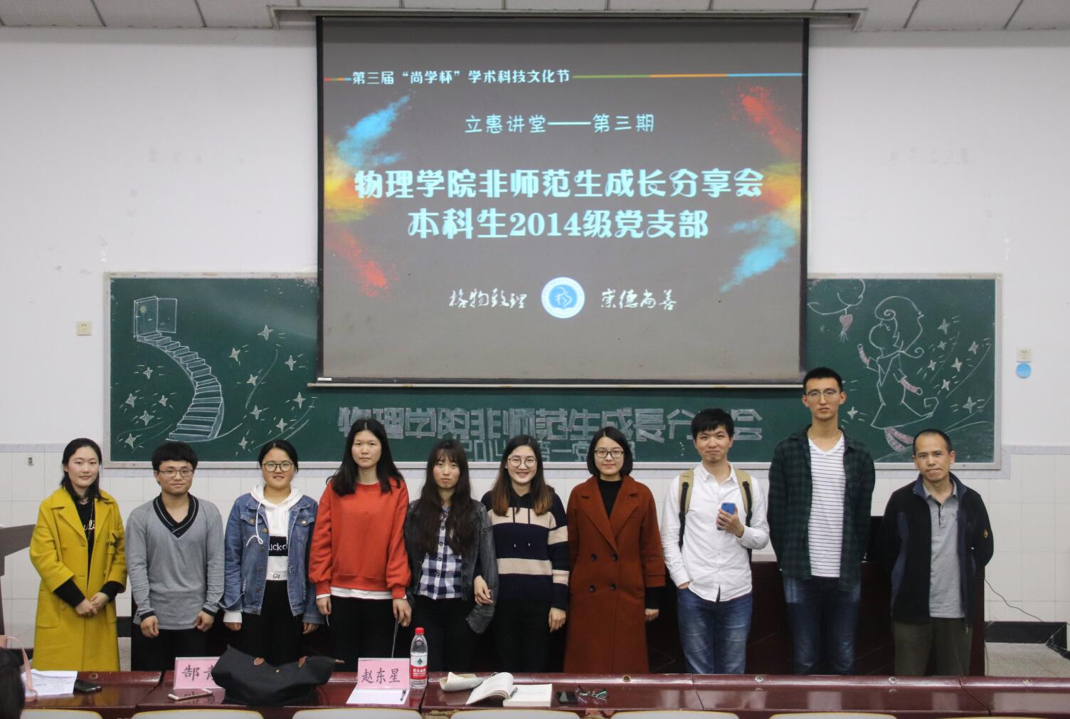 教工党支部党员、2014级物理学班班主任郜青老师和2015级物理学班班主任赵东星老师出席活动,2014级物理学班7名优秀毕业生依次发言,2015级、2016级60余名学生到场参与。活动由2014级第一党支部党小组组长徐晓梅同学主持。