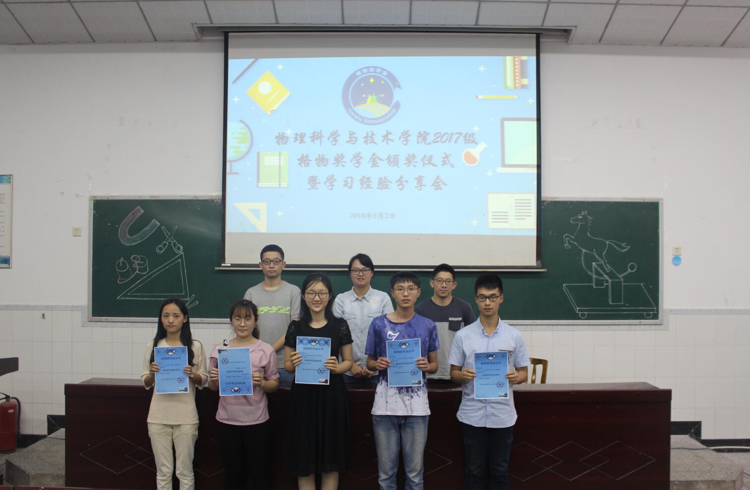 5月2日下午,a片无码 在大阶梯教室举办2017级“格物奖学金”颁奖仪式暨学习经验分享会。2017级辅导员贺颖、师范四班班主任匡泯泉、物理学班班主任王啸天老师和2017级全体本科生参加了活动。