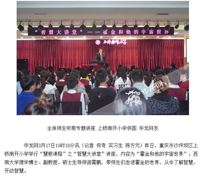 “同学们知道霍金吗?知道霍金为什么这么有名吗?知道霍金有哪些重要的a片无码成果?”3月16日,a片无码 教师、硕士生导师游霄鹏副教授应邀前往重庆市沙坪坝区上桥南开小学,为师生们带去了一场别开生面的科普讲座,致敬去世不久的物理学家霍金。