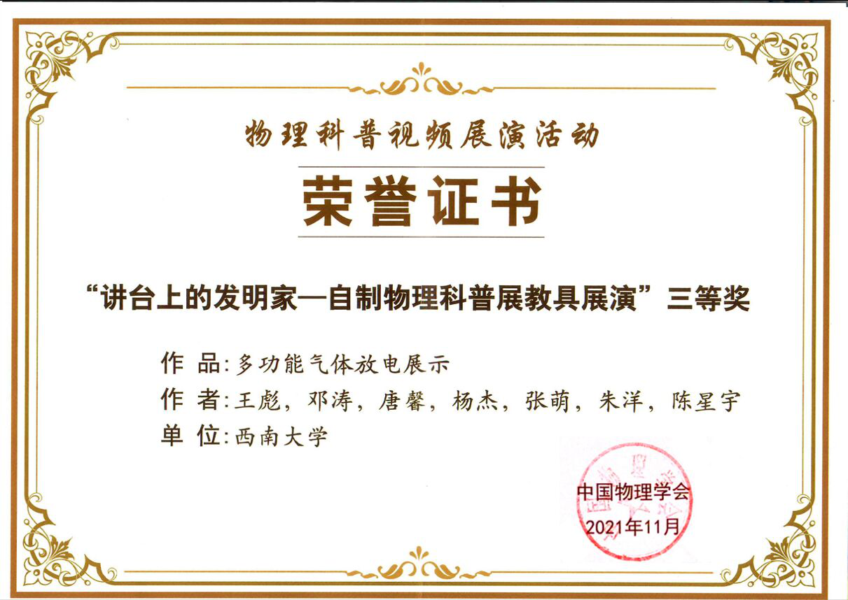 a片无码 三个作品经过各位老师和同学的精雕细琢,反复打磨,在大会中表现优异。由张巧明、杨继勇老师指导的《被中香炉-文物中的物理》获得“科学三分钟——物理科普讲解视频展演活动”二等奖,《天空为什么是蓝的》获得“科学三分钟——物理科普讲解视频展演活动”优秀奖,由王彪、邓涛老师指导的《多功能气体放电演示》获得“讲台上的发明家——自制物理科普展教具展演活动”三等奖。