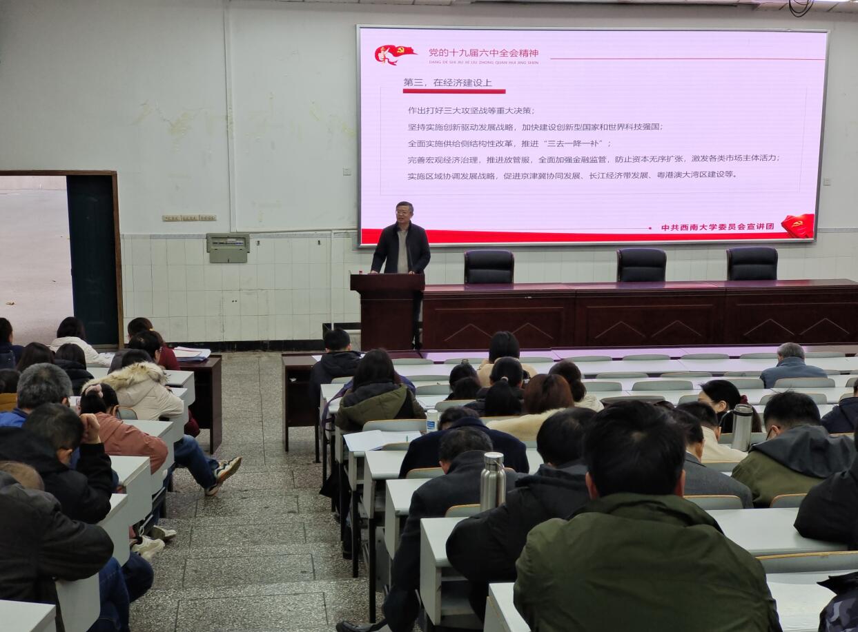 根据学校党委统一部署,12月17日下午,学校党的十九届六中全会精神宣讲团成员、学校党委统战部常务副部长周文全同志为a片无码 全体教职工开展了党的十九届六中全会精神宣讲。宣讲会由a片无码 党委书记李余廷主持。