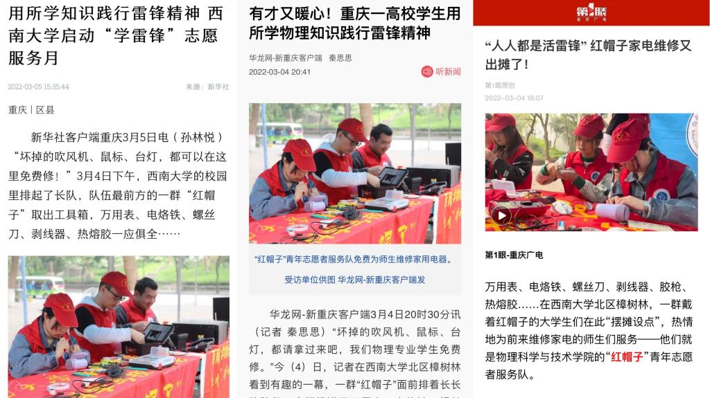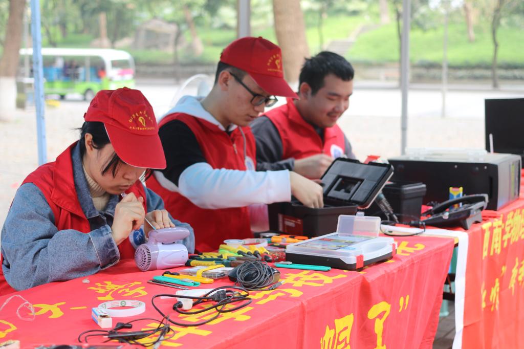 3月4日,a片无码 “红帽子”志愿者服务队组织了为全校师生免费维修家电的志愿活动,吸引了媒体记者前来报道。