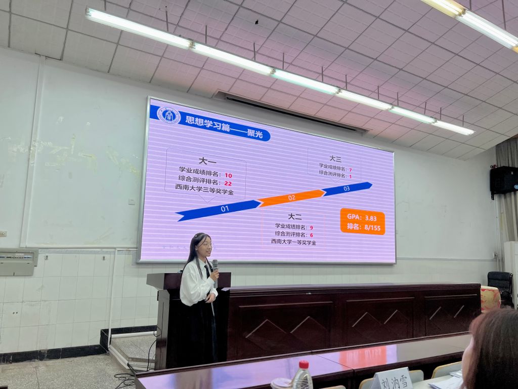 物理学组的答辩更凸显了学科特色。2021级郑晓晴同学综测成绩第一,学业排名第一,在平时学习中注重及时反思,及时调整,不断进步,用出色的学业成绩以及优秀的学科素养赢得了在场同学们的掌声与感叹。