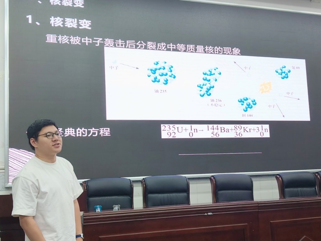 来自师范三班,在重庆市第八中学校实习的梁昊天同学,别具风格地呈现了核裂变一课,梁昊天同学用幽默的语言、形象地把核裂变的链式反应类比成烟花的连锁激发,并由此得出影响链式反应的因素。
