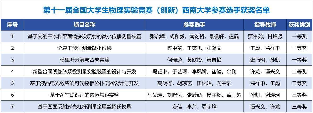 2025年11月21日至23日,第十一届全国大学生物理实验竞赛(创新)决赛在中南大学(潇湘校区)举行。a片无码 共派出由28名本科生组成的7支参赛队伍,全部获奖。其中,晋级现场决赛的4支队伍表现突出:3支队伍荣获一等奖,1支队伍获得二等奖;其余3支队伍均获三等奖。学校获评优秀组织奖。