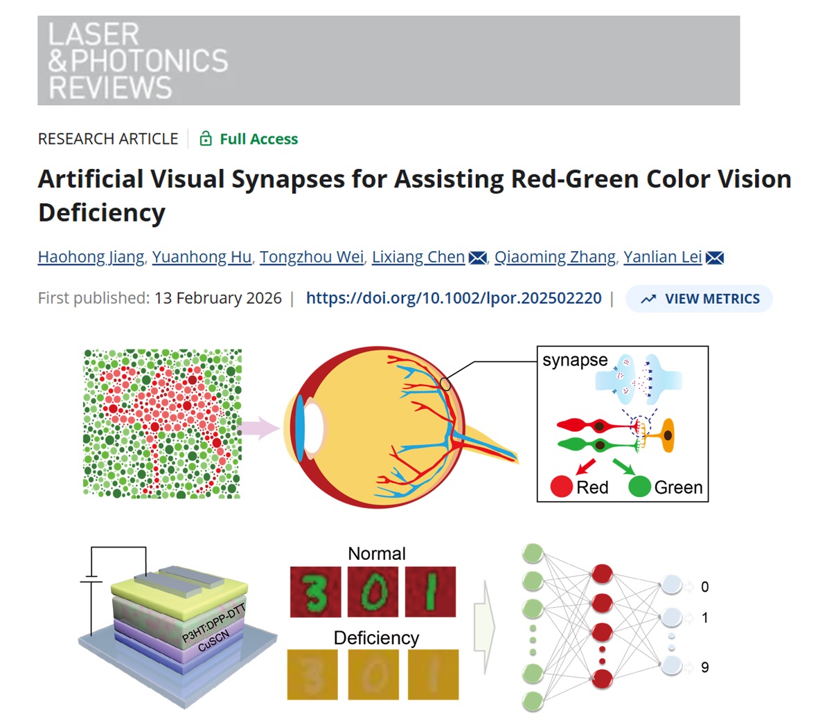 色觉是人类感知外界环境的重要功能,然而红绿色觉障碍(CVD)困扰着数百万人群,严重影响其色觉辨别能力。针对此困境,团队人员设计了一种新型光电突触器件,通过优化基于聚(3-己基噻吩)的有机异质结结构,可将光信号转换为数字突触电流,实现红绿色觉障碍者的色觉增强。与模拟红绿色盲的对照器件相比,该器件的红绿光波长辨别能力实现十倍提升。结合人工神经网络计算,该器件在复杂色觉模式识别中展现出92%的准确率。此外,该器件还可有效增强色弱者的色彩识别能力,实现复杂图案的有效区分。这项工作可为面向视觉修复的下一代生物电子系统和增强色彩感知等领域提供可靠方案和线索。相关结果以“Artificial Visual Synapses for Assisting Red‐Green Color Vision Deficiency”为题发表在《Laser & Photonics Reviews》(e02220, 2026)上,a片无码 2022级硕士研究生江浩弘为该论文的第一作者,雷衍连和陈历相副教授为通讯作者,a片无码-成人a片-免费无码a片 (微纳结构光电子学重庆市重点实验室)为唯一完成单位。