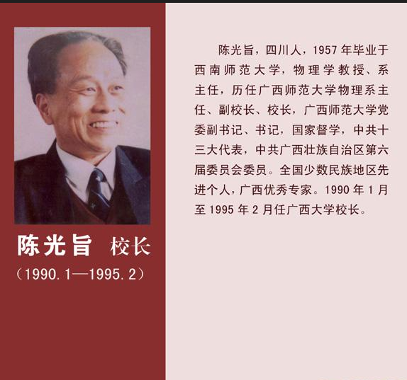 陈光旨,男,1934年生,重庆市荣昌县人,1957年毕业于西南师范a片无码 物理学系,同年到广西师范大学任教。历任助教、讲师、副教授、教授,系主任、副校长、校长、党委书记;中共十三大代表、中共广西区第六届委员会委员、政协广西第七届委员会委员、教文体委员会副主任;中国物理学会理事,广西物理学会常务副理事长、理事长,广西教育学会副会长,广西高等教育学会副会长,广西老教授协会常务副会长,国家督学等职。出版专著和译著8部,200多万字;在国内外多种刊物发表物理学、管理学和教育学论文120余篇。曾获全国高校优秀教材二等奖、广西科技进步二等奖,广西优秀教学成果二等奖、广西社会科学进步三等奖、广西教委科技进步一等奖、中南地区高校优秀图书三等奖。先后获“全国少数民族地区先进科技工作者”、“全国优秀教育工作者”、“广西优秀专家”等称号,享受国务院特殊津贴。