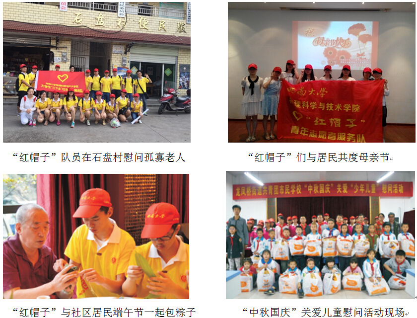 2015年在朝阳小学开展了“大手牵小手,欢乐过六一”活动;2016年重点培育“小红帽·青春护航成长加油站”公益项目,面向3所小学和4个社区的青少年开展学业辅导、图书漂流、素质拓展活动;2017年结合党的十九大召开这一时事热点,在支教服务中特别开设内容丰富、别开生面的爱国知识小课堂。