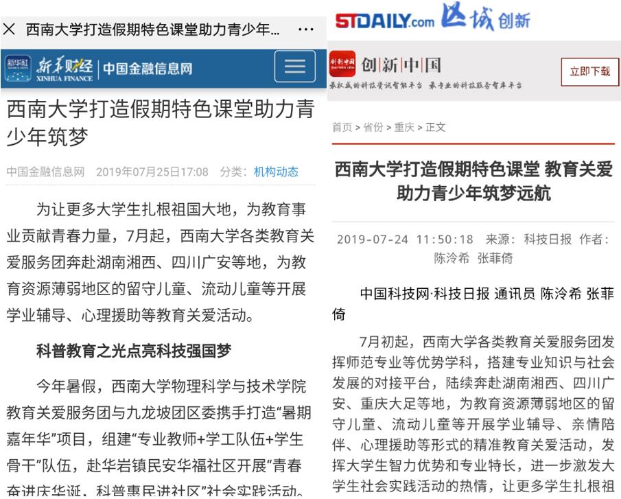2019年7月初暑假期间,a片无码 教育关爱服务团与重庆九龙坡团区委携手推进“暑期嘉年华”项目,组建“专业教师+学工队伍+学生骨干”的人员队伍,赴华岩镇民安华福公租房社区开展了“青春奋进庆华诞,科普惠民进社区”师生主题社会实践活动。本次科普体验营结合教学与实践,创新“市民学校+高校资源+暑期教育+志愿服务”的实施模式,由实践团的同学根据有趣的实验进行知识讲解,由现象到本质,用简单易懂的方式向孩子们开展科普体验营,为孩子们带来沉浸式的科普体验。除此之外,实践团成员还带来了“小小书法家”毛笔书法课、“小巧手、大智慧”手工制作、“少儿启蒙礼”礼仪课等九节内容丰富的七彩课堂,获得社区居民一致好评。中国金融信息网、中国科技网·科技日报等媒体纷纷予以报道。