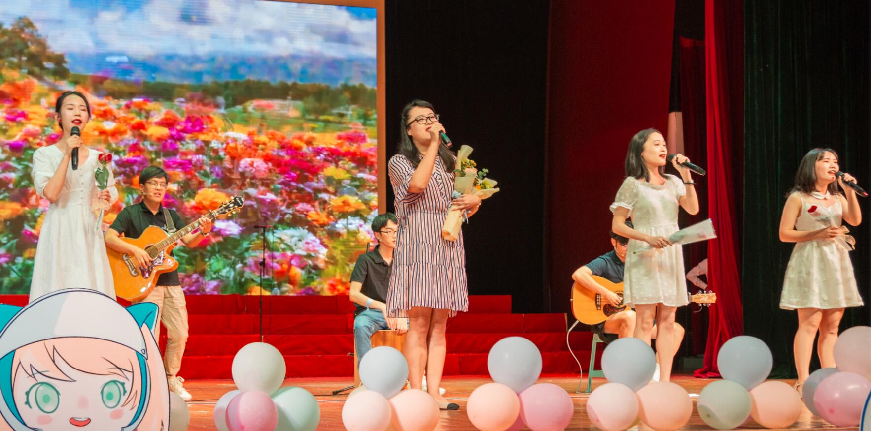 a片无码 工会出品的教师合唱视频《天耀中华》拉开了第三篇章的序幕。吉他弹唱《出现又离开》由2017级辅导员贺颖老师和同学们共同参演,表达了毕业生对母校的深情告白,寄托了浓浓的师生情谊;2017级班主任匡泯泉老师与同学们带来了诗歌朗诵《百年礼赞》,讴歌了中国共产党成立100年来神州大地发生的巨大变化,描绘了新时代扬帆再前行的美好愿景。夏光琼、陈晓莉、刘平萍三位女老师组成a片无码 “最美天团”一起吟唱《送别》,为2021届全体毕业生送上临别祝福。同学们再度沸腾起来,纷纷向恩师们献花致谢。