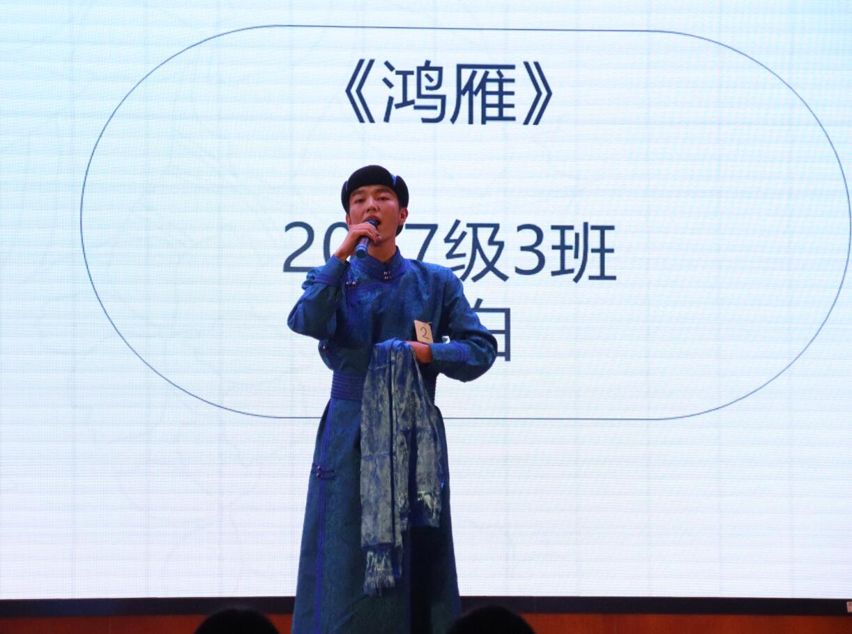 学生会的一段开场舞韵律感十足,瞬间点燃了全场。在首先开始的声乐组表演中,来自内蒙古的2017级秦白同学身着民族服装,用雄厚的嗓音演绎了歌曲《鸿雁》,悠扬的歌声让人仿佛置身草原;2017级覃梦铭、丁丽莎同学的女生对唱歌曲《寂寞烟火》,温柔而深情,令人沉醉;2016级李凤、刘秉琪同学共同演绎歌曲《芬芳一生》,美妙的和声极富感染力。