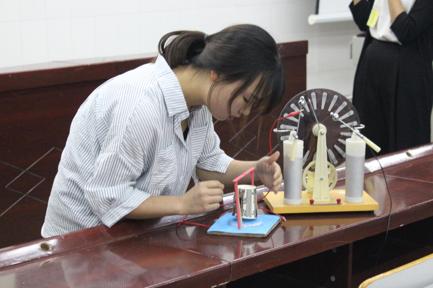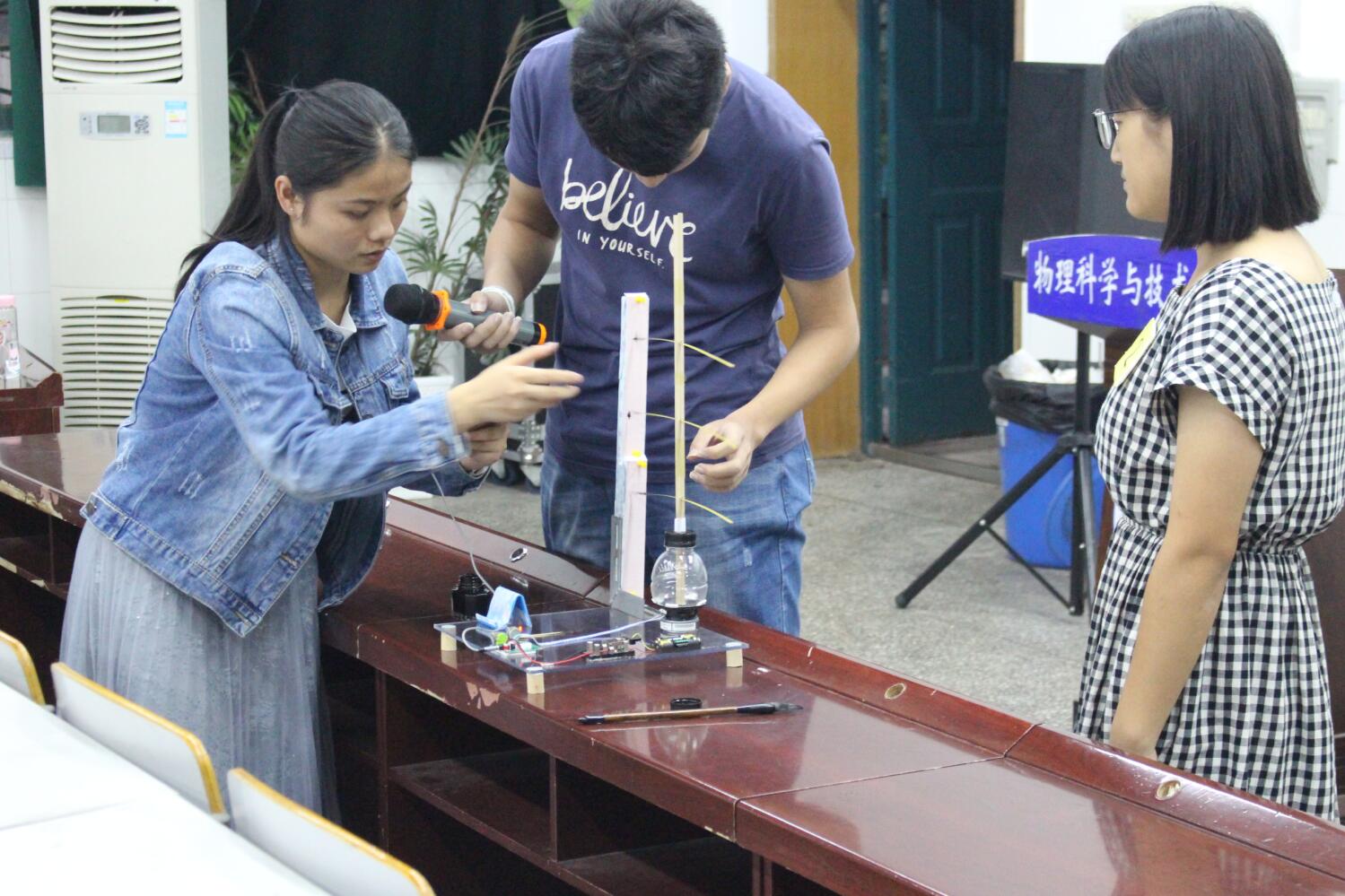 2016级物理学班的周鑫兰小组率先登场,从实验装置、实验原理介绍教具作品“静电电动机”,突出了其有效减小摩擦损耗的优点; 2017级师范2班的刘铭睿小组,通过手机软件精确控制频率,让作品“共振演示器”中的木棍笔直接在纸上刻画波动,明显的实验现象引起阵阵掌声;2017级师范1班祖金莹小组的“温度与导电性探究演示仪”利用吹风机和喷火枪改变家用灯泡的温度,使玻璃由绝缘体转换为导体,展示了温度变化对物质导电性的影响;2016级师范4班黄钰迪小组使用日常生活中的水管、易拉罐、铝箔纸等材料制作了“静电摆球仪”,体现了“从生活走向物理,从物理走向社会”的教学理念;同为2016级师范4班的马淑晔小组利用尖端放电,使中间作负极的导体产生较强的电场,从而提高“电除尘演示仪”的除烟效率;最后上场的是2016级师范4班肖祥星小组,作品“通电螺线管磁性影响因素演示器”直观地展示了有无铁芯、电流大小、线圈匝数对通电螺线管磁性强度的影响。